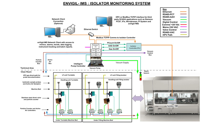 The intelligent pump controller (P5050) supports up to eight particle counters with a central vacuum pump and up to eight active air samplers and includes a digital control interface to the Isolator controller PLC. enVigil-IMS is complete with an application specific GAMP compliant documentation suite that includes a Functional Design Specification and Installation and Operational Acceptance Test Protocols allowing the enVigil-IMS system to be easily designed, configured, installed, commissioned and verified.